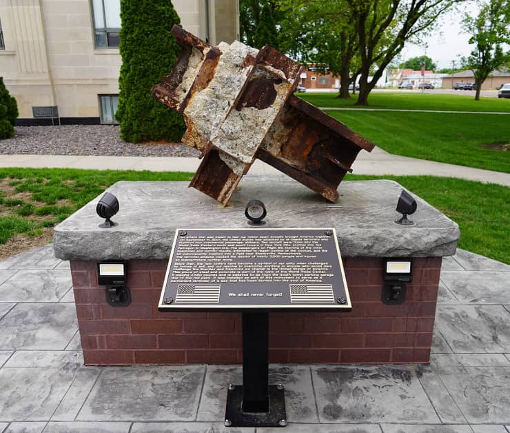 Unlike the bronze “America’s Response Monument” in New York City, the Washington, Kansas memorial is a unique local tribute featuring regional materials and specific historical artifacts.